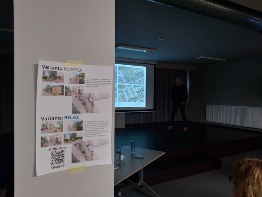 U prostoru před školou se probíraly dvě varianty. Bylo možné si na místě i zahlasovat pro tu kterou variantu. Ze samotného přestavení vzešly jen dva hlasy. Skoro stovku hlasů jsme ale získali díky spolupráci se školou, která nám anketu poslala do bakalářů, a rodiče i žáci pak dali výrazně přednost variantě nazvané Relax, která pracuje s úpravou současné stříšky u vstupu: nově by měla být subtilnější, ale s větší plochou, takže poskytne více prostoru při nepřízni pro čekající rodiče či děti. Podstatnou součástí bude nový krytý kolostav a zakrytí kontejnerů na odpad.